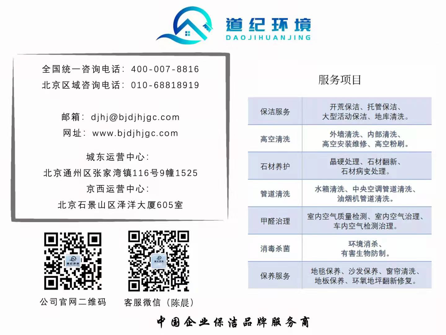 春季到來,道紀高空外墻清洗事業部竭誠為您服務。咨詢電話:010-68818919,我們可為您提供一站式服務,高空外墻清洗,家庭、企事業單位開荒保潔,車庫清洗、石材養護,空氣治理,甲醛治理、蟲害治理等,我們可以為您帶來更真實的藍天,更潔凈的生活環境,
