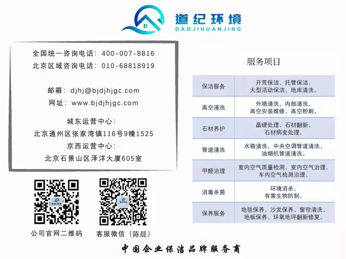 道紀環境提供石材護理、外墻清洗、甲醛治理、消毒殺菌、管道清洗、保養服務、保潔服務的定制類清潔服務,提供大型活動清潔保障工作。更多詳情請點擊 http://bjdjhjgc.com/