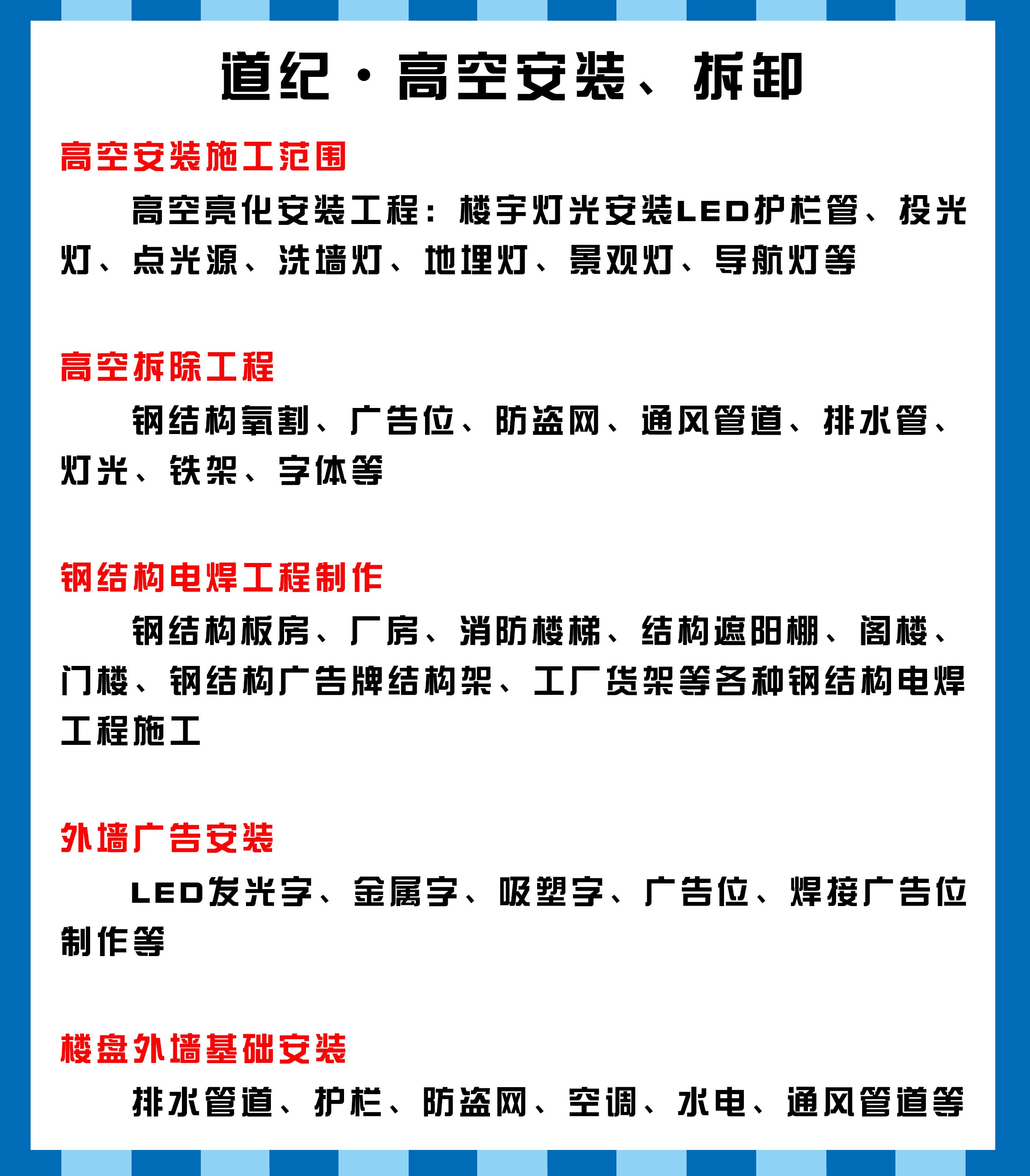 鋼結構氧割、廣告位、防盜網、通風管道、排水管、燈光、鐵架、字體等
